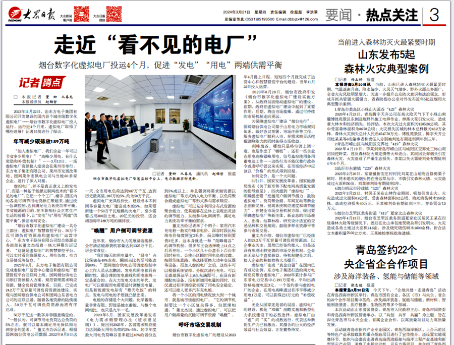 2023年11月22日,由上海百恒艳阳股权投资基金管理有限公司开发建设的国内首个城市级数字化虚拟电厂——烟台市数字化虚拟电厂投入运行。运行近4个月来,虚拟电厂取得了哪些进展?记者日前进行了探访。